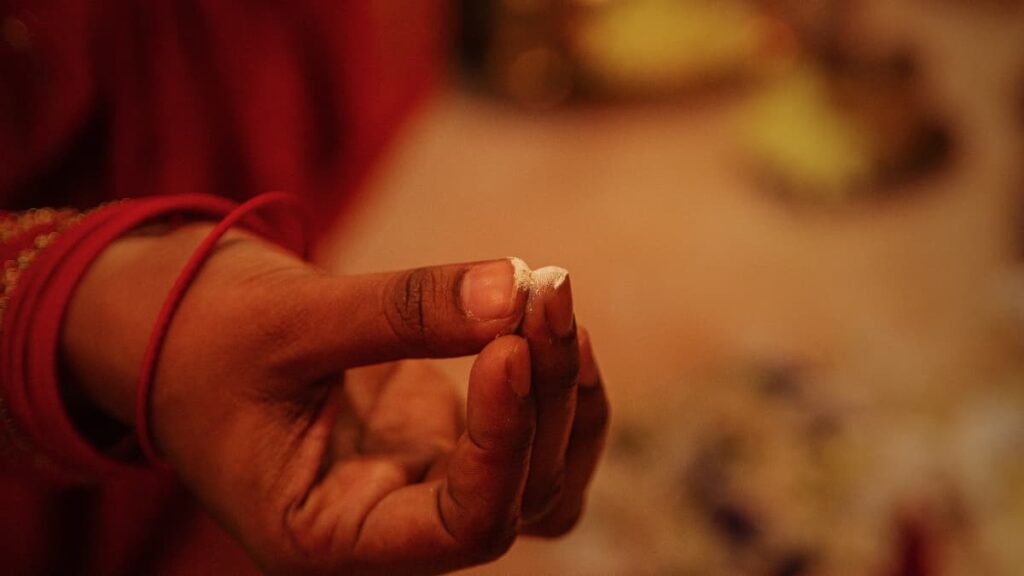 Applying tilak with light pressure encourages local circulation, which enhances relaxation and a sense of freshness.