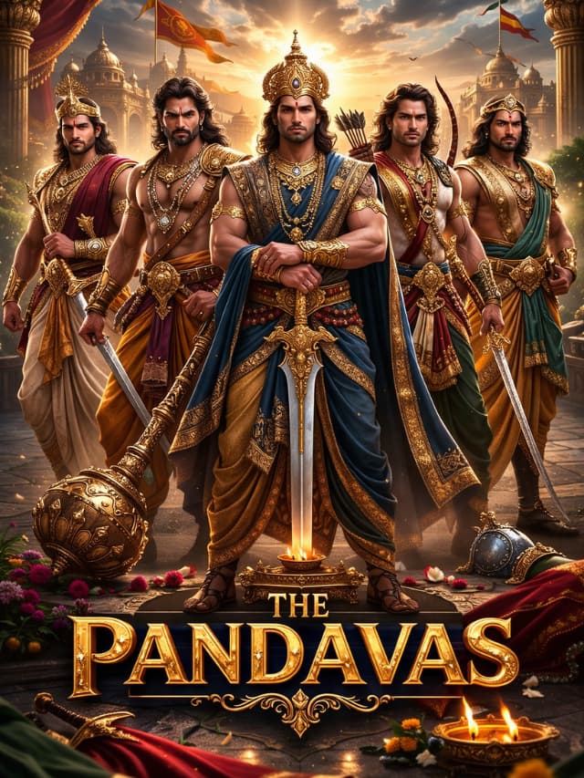 The Pandavas fought the 18-day Kurukshetra War against the Kauravas — a battle of Dharma vs Adharma.